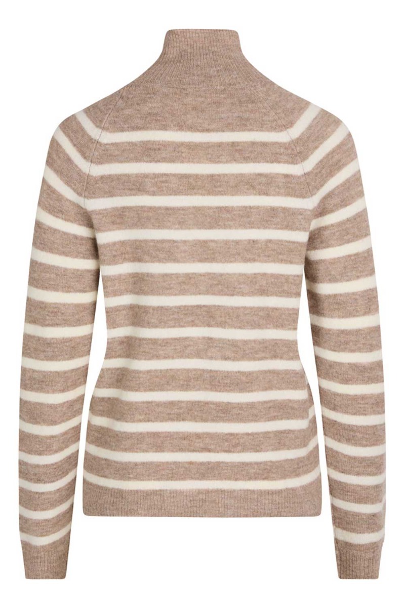 En dejlig strik fra BZR i et klassisk udtryk med stribet mønster i beige og hvid. Strikken er lavet i en utrolig behagelig kvalitet med mohair og uld hvilket holder dig varm hele vinteren. Den har en lille t-neck med lange ærmer og ribkant i alle ender. Style den med cindy sus bukser eller jeans.