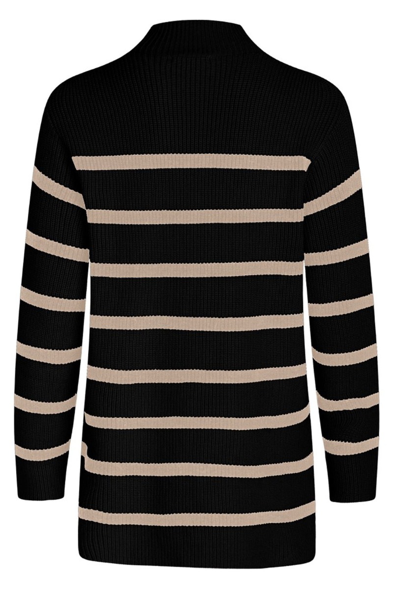 En flot strik fra BZR i sort med beige striber. Strikken har en oversize løs pasform med ekstra længde og slids i begge sider. Den har en høj o-neck og lange ærmer. Style den til tights eller over jeans alt efter dit humør.