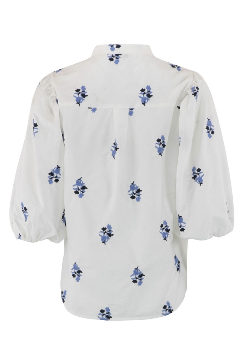 Sød hvid bluse med blå broderet blomster på fra Continue. Blusen har kina krave med knapper foran og peplum i bunden. Den har 3/4 lange volumiøse ærmer der afsluttes med elastikkant. Style denne bluse til hverdagen med shorts eller en buks.