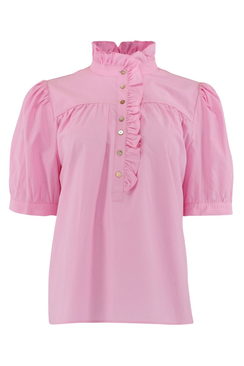 En smuk bluse fra Continue i en fin pink farve som er perfekt til denne sæson. Den er er løs i pasformen og kan nemt burges til hverdag med et par sandaler. Den er med korte ærmer som har en smule pufeffekt i sig. Og den har smukke flæser ved kraven og ved knaplukningen ved brystet. Den findes også i en bluse model.