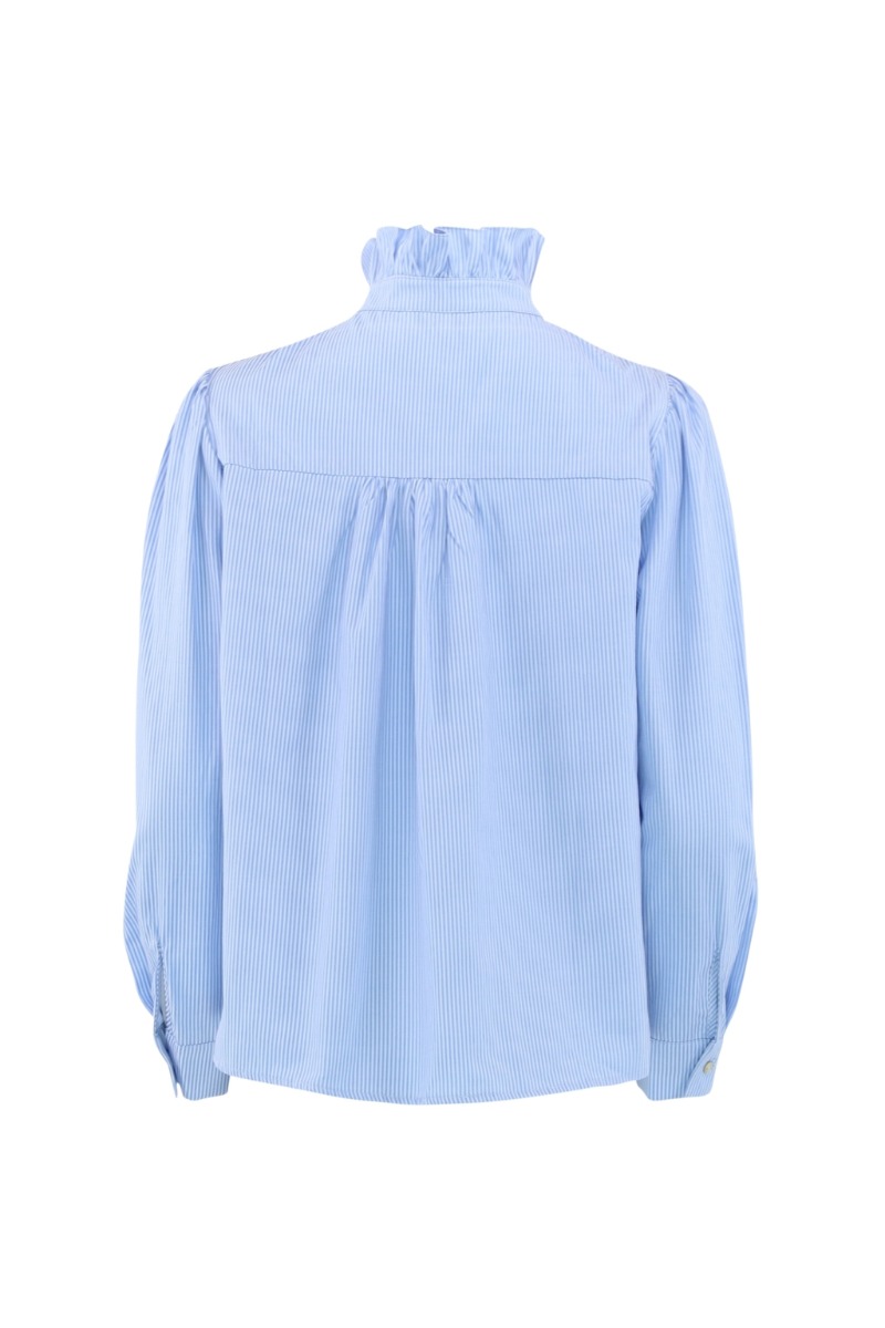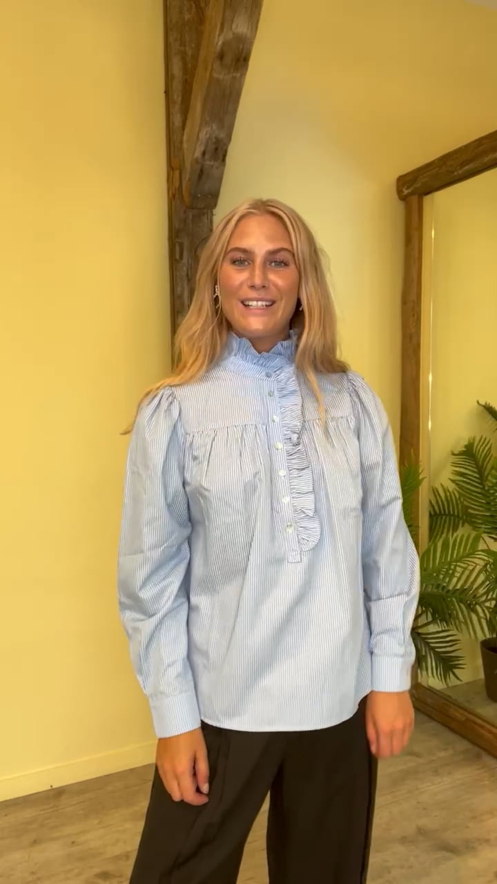 En fin bluse fra Continue med striber i hvid og lyseblå. Den er med knapper foran som markeres med en lille flæsekant. Derudover er den perfekt til hverdag med et par jeans eller en nederdel.