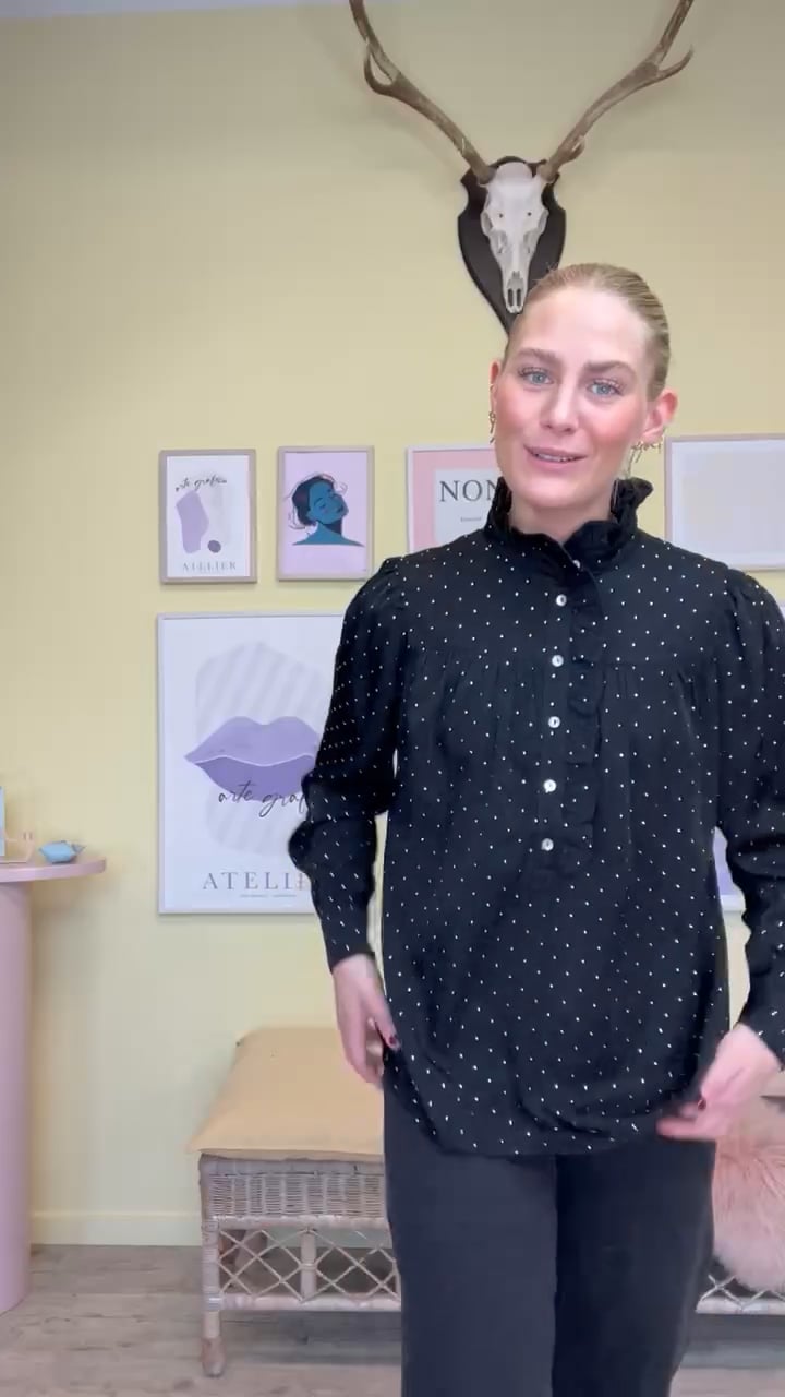 En fin bluse fra Continue er kommet i sort med smukke sten limet fast over et hele. Den er med knapper foran ned til midt på brystet, derudover er der flæsedetaljer ved hals og brystet. De små sten gør denne style fin til fest sammen med et par stiletter eller også til hverdag med en blazer over.
