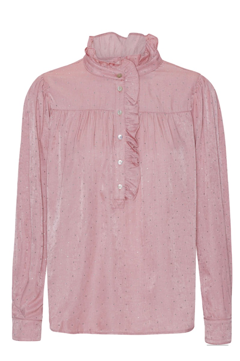 Den sødeste bluse fra Continue er kommet i en smuk ny farve. Den er nemlig kommet i rosa men stadig med de mange fine nitter limet på. Den er løs i pasformen og har flæsedetaljer ved brystet og halsen. Den findes i flere farver.