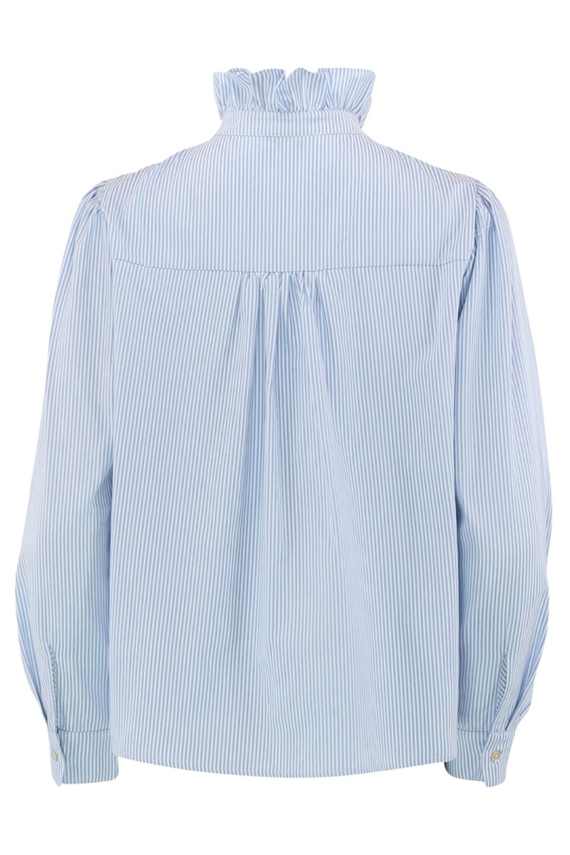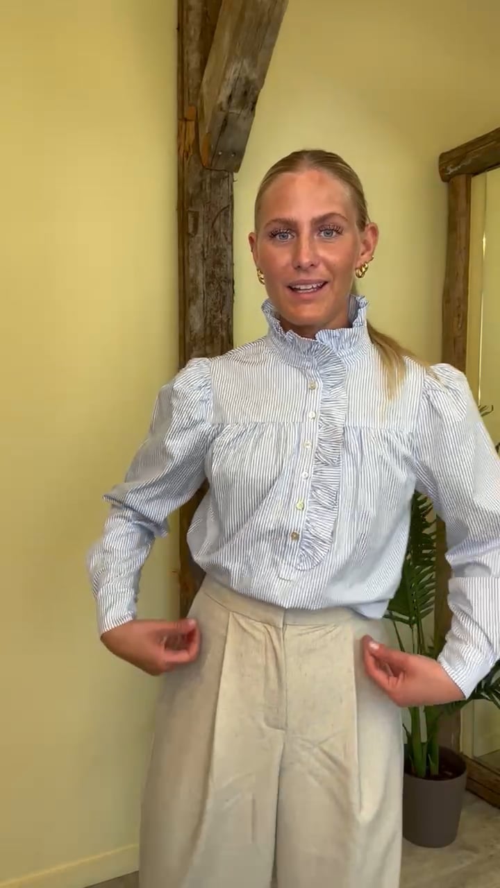 Endnu en skøn bluse fa Continue er landet med striber i lyseblå og hvid. Den er løs i pasformen og har smukke flæsekanter ved hals og bryst. Den er med knapper ned foran men kan halvt ned ved brystet. Den er fin til et par jeans eller en nederdel.