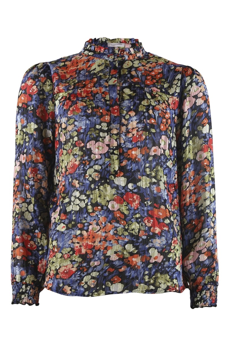 Feminin bluse fra Continue i et fint blomsterprint med navy baggrund. Blusen er let gennemsigtig med knapper foran ved kraven. De lange ærmer afsluttes med en bred smock. Brug den både til jeans, sorte bukser eller en pæn buks alt efter anledning.