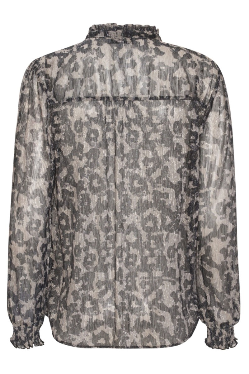 Sort bluse fra Continue i en let gennemsigtig kvalitet med stretch. Blusen har et feminint leo print med glimmerdetalje. Foran knappes den og afsluttes med en sød lille flæsekant i kraven. De lange ærmer har smock ved håndleddet. Style med de matchende bukser til de kommende fester.