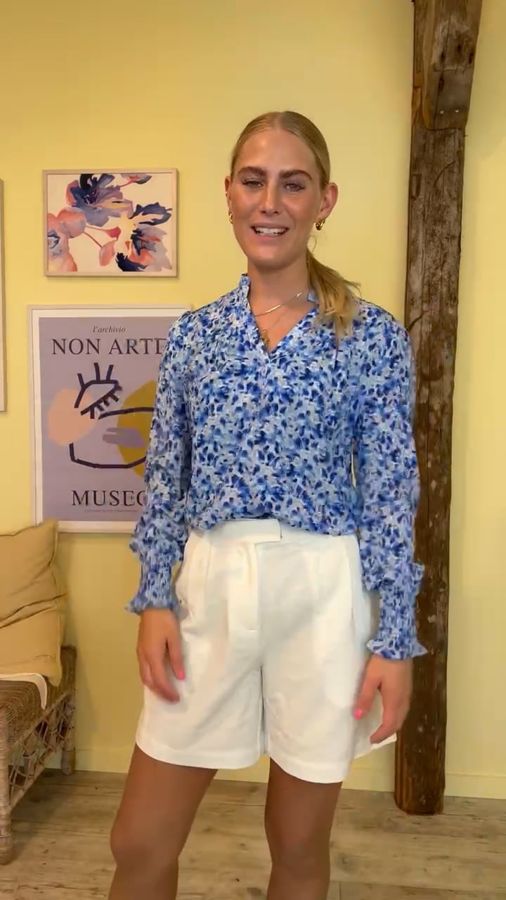 Feminin bluse fra Continue i et grafisk mønster i blå nuancer. Blusen har en lille v-udskæring foran og flæsedetalje langs kraven. De lange ærmer afsluttes med en bred smock der giver et lille løst udtryk. Style den til både jeans, nederdele eller en pænere buks.
