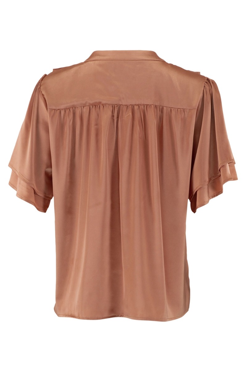 Feminin bluse fra Continue med matchende bukser i samme fine farve. Blusen har en lille v-udskæring foran og flæsedetaljer. Blusen har et lille løst t-shirtærme og er med en flot shineeffekt i stoffet.