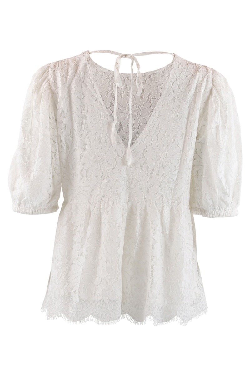 Smuk hvid bluse fra Continue med broderi. Blusen har et feminint udtryk med peplum i bunden og den fineste ryg der er åben bagtil og snøres i nakken. Blusen har korte pufærmer der afsluttes med elastikkant og er foret indvendigt.