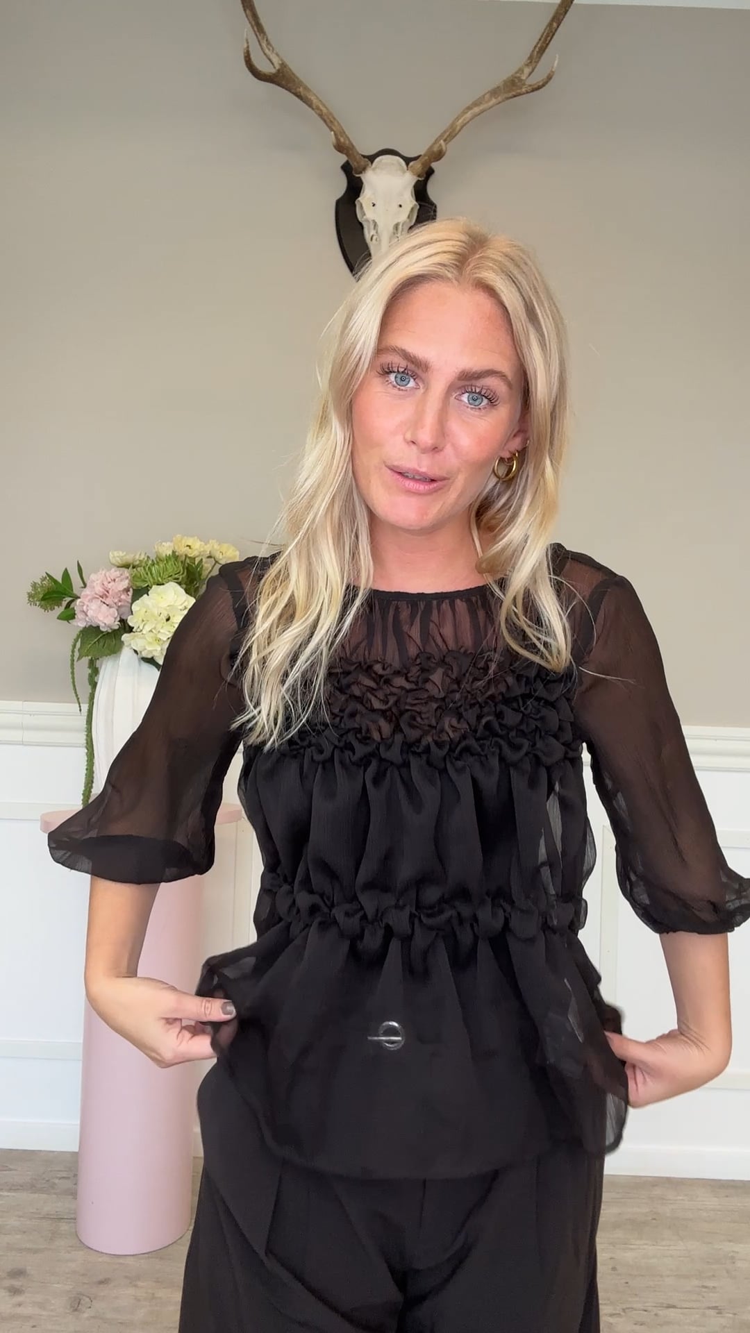 Den fineste bluse fra Continue med feminine detaljer. Blusen er i en smuk brun nuance der er let gennemsigtig og med det fineste rynkeffekt ved barmen. Den runde halsudskæring lukkes i nakken med en stofbetrukket knap. Blusens ærmer er med 3/4 der afsluttes med elastikkant. Style den både til hverdag og fest.
