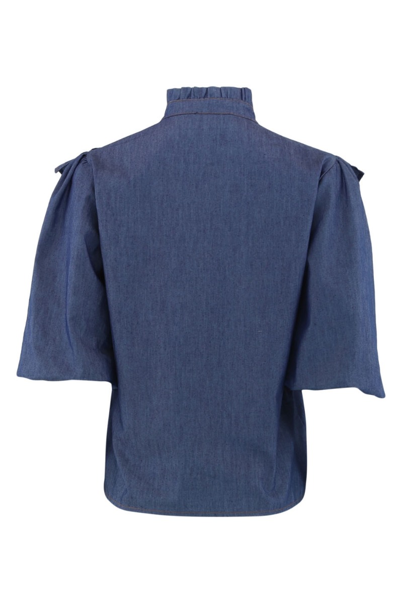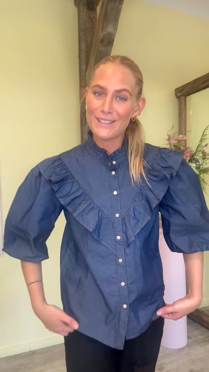 Endnu en fin og feminin bluse fra Continue. Denne bluse har knaplukning fortil, korte ærmer og er designet i en let kvalitet. Blusen har søde flæsedetaljer ved kraven samt på brystet. Den kan nemt bruges både til hverdag og særlige anledninger.