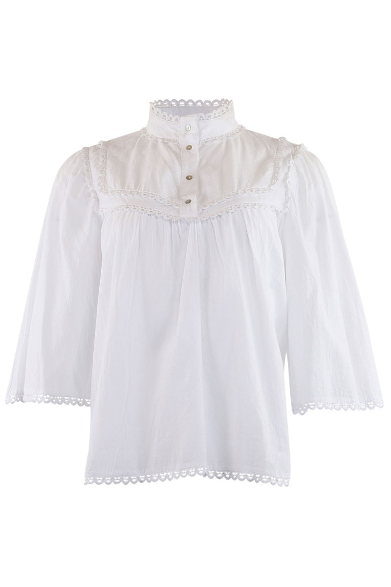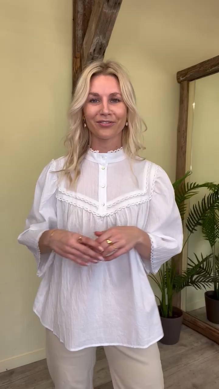 Sød enkel bluse fra Continue i hvid med et lille fint broderet mønster ved barmen. Skjorten har løse brede 3/4 ærmer i et fint snit. Den er super sød at style med shorts, jeans eller bukser.