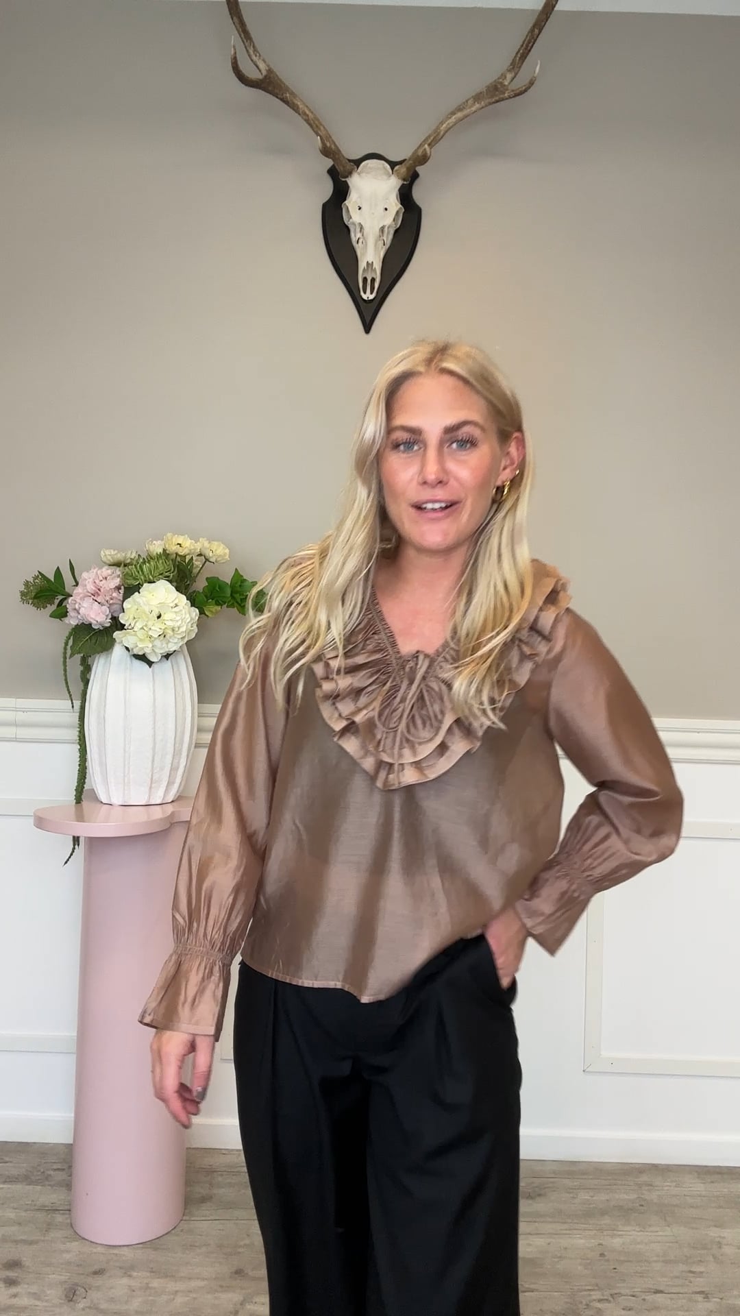 En smuk bluse fra Continue er kommet i denne smukke, smukke brune farve. Den er med søde flæser og et feminine snit. Den kan nemt bruges til fest med en nederdel eller til hverdag med et par bukser.