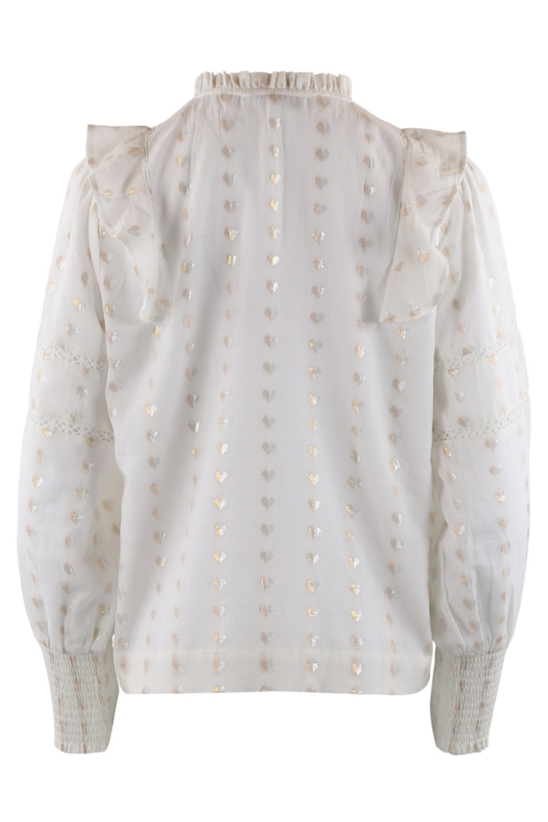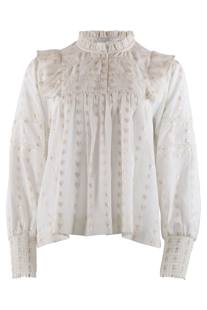 Endnu en af disse fine bluse fra Continue, denne gang er farven på hvid men stadig med det søde glimmer hjerter der er vævet ind i stoffet. Der er hæklet detaljer ved bryst og på ærmerne, samt ærmerne afsluttes med et bredt smock stykke. Foran kan man knappe en anelse ned og kraven har en fin flæsekant hele vejen rundt.