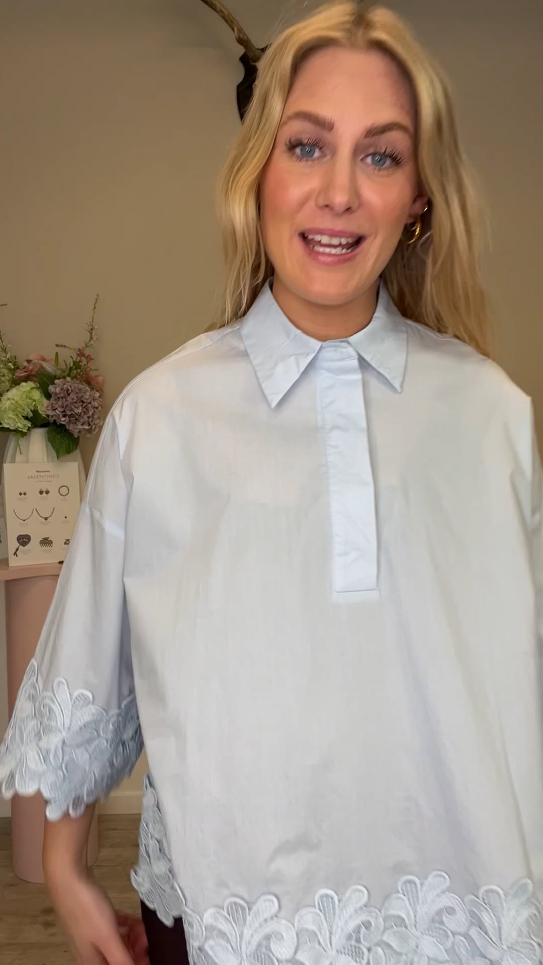 Skjorten er lyseblå og har et løst, oversized fit med en klassisk krave og kort knaplukning foran. Den har brede 3/4-ærmer, som giver et afslappet og moderne udtryk. Nederst er den pyntet med en bred blondekant i et blomsterinspireret mønster, der også går igen ved ærmekanterne. Stoffet falder let og giver et blødt, feminint look med fine detaljer. En elegant skjorte, der kan styles både casual med jeans og mere festligt med pæne bukser.