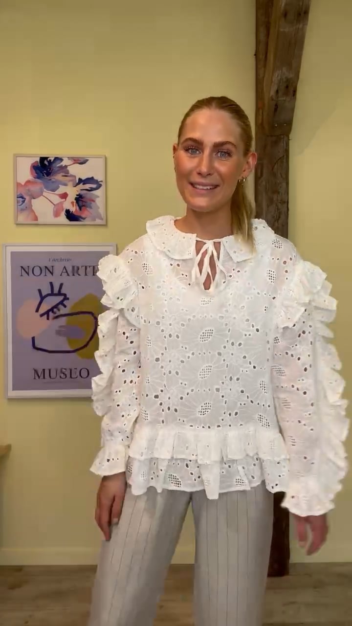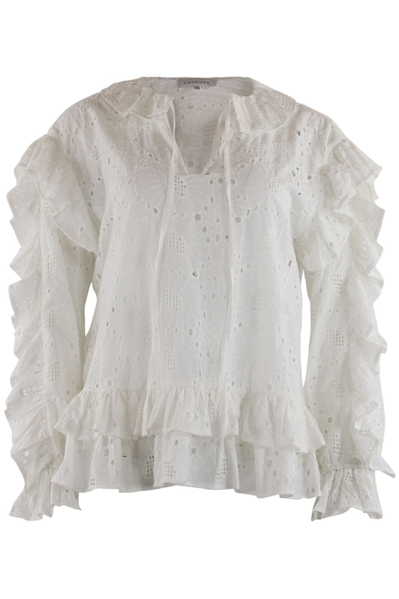 Sød bluse fra Continue med et stort broderimønster. Skjorten er hvid med en bred flæsekant i kraven og snøredetalje foran der skaber en lille dråbeformet åbning foran. De lange ærmer afsluttes med elastik og har så mange fine unikke detaljer.