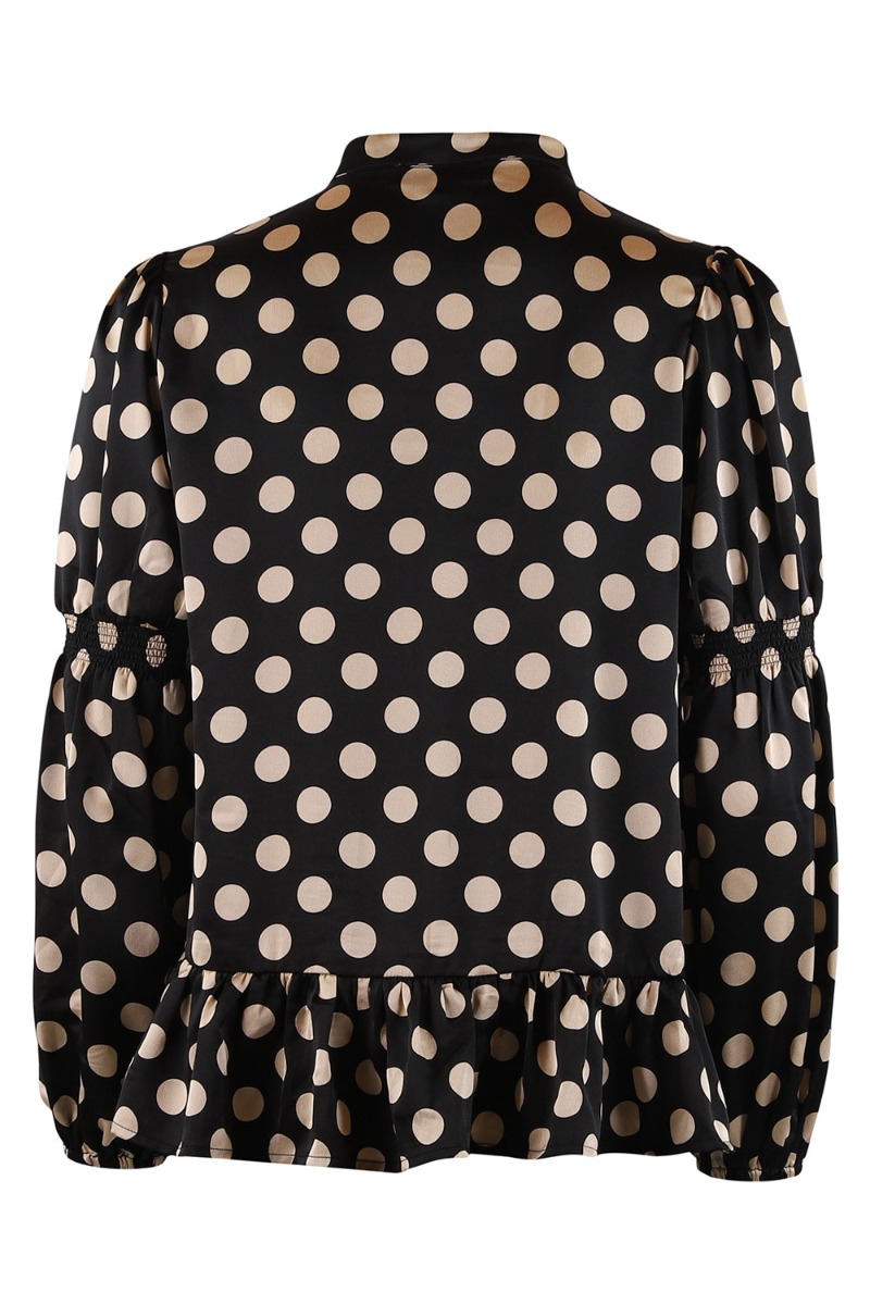 Super sød bluse fra Continue i sort med beige prikker. Blusen er lavet i et let materiale med shineeffekt. Den runde udskæring lukkes foran med knapper og har peplum i bunden. De lange ærmer er designet med smock ved ærmet der giver en sød to-delt-effekt.