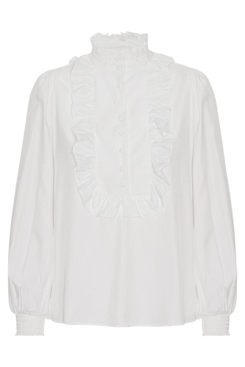 Sød enkel bluse fra Continue i hvid med søde flæsedetaljer foran og ved kraven. Blusen er i en let løs kvalitet med lange ærmer der afsluttes med en bred smock. Foran har den stofbetrukket knapper og kan bruges til alle anledninger.