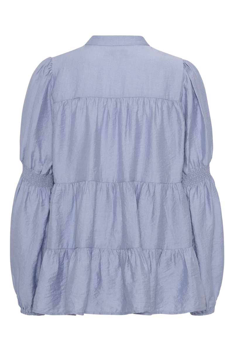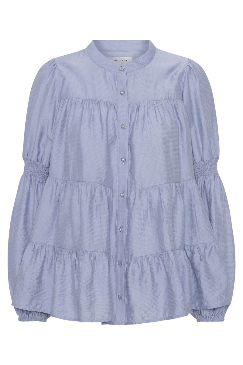 Super sød model fra Continue i blå med peplum der giver et ballon-snit. Ærmerne har smock der giver et lille puffet look og lukkes foran ved den runde hals med knapper hele vejen ned. Style blusen med jeans.