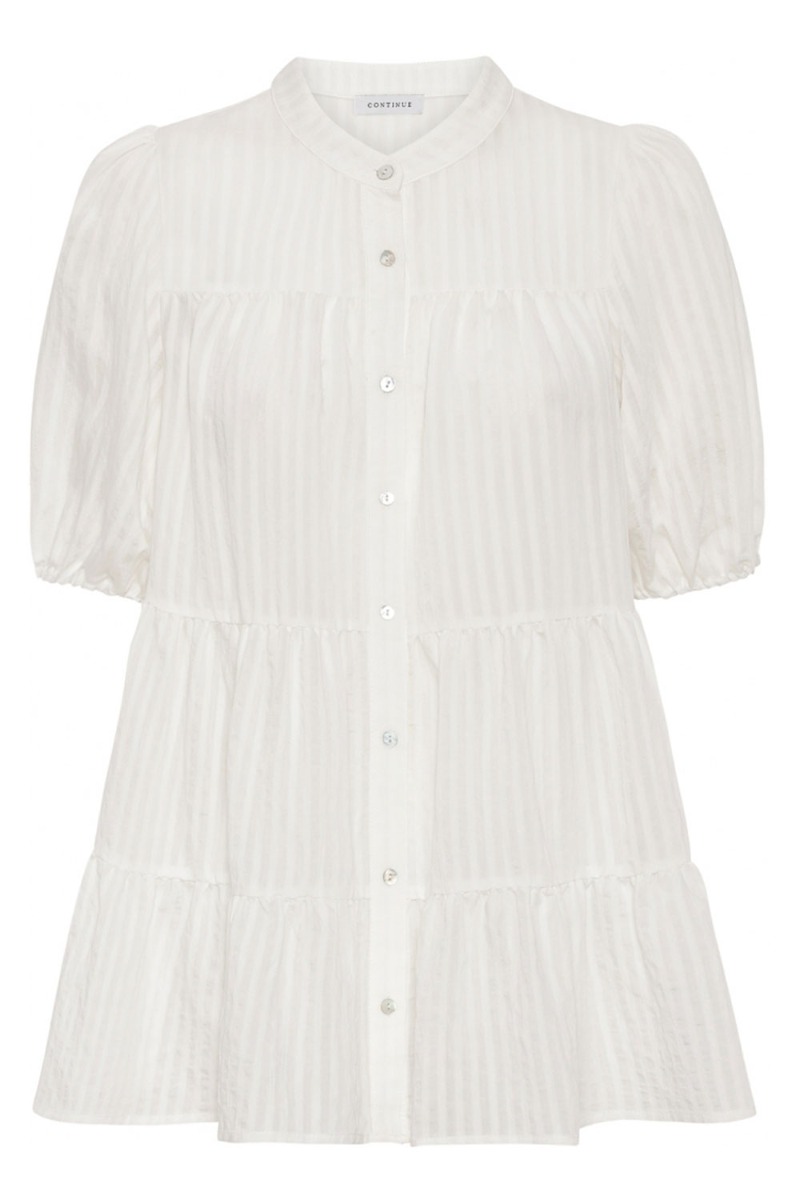 Fin bluse fra Continue der er perfekt at style til hverdag med et par jeans eller bukser. Blusen er rummelig i et ballon-snit med peplum og små pufærmer. Den lukkes foran med knapper hvilket gør den ammevenlig. Blusen er hvid med et lille stribet mønster.