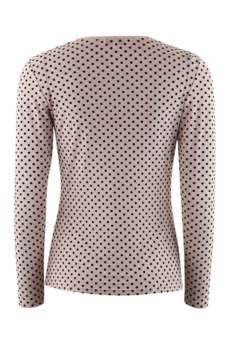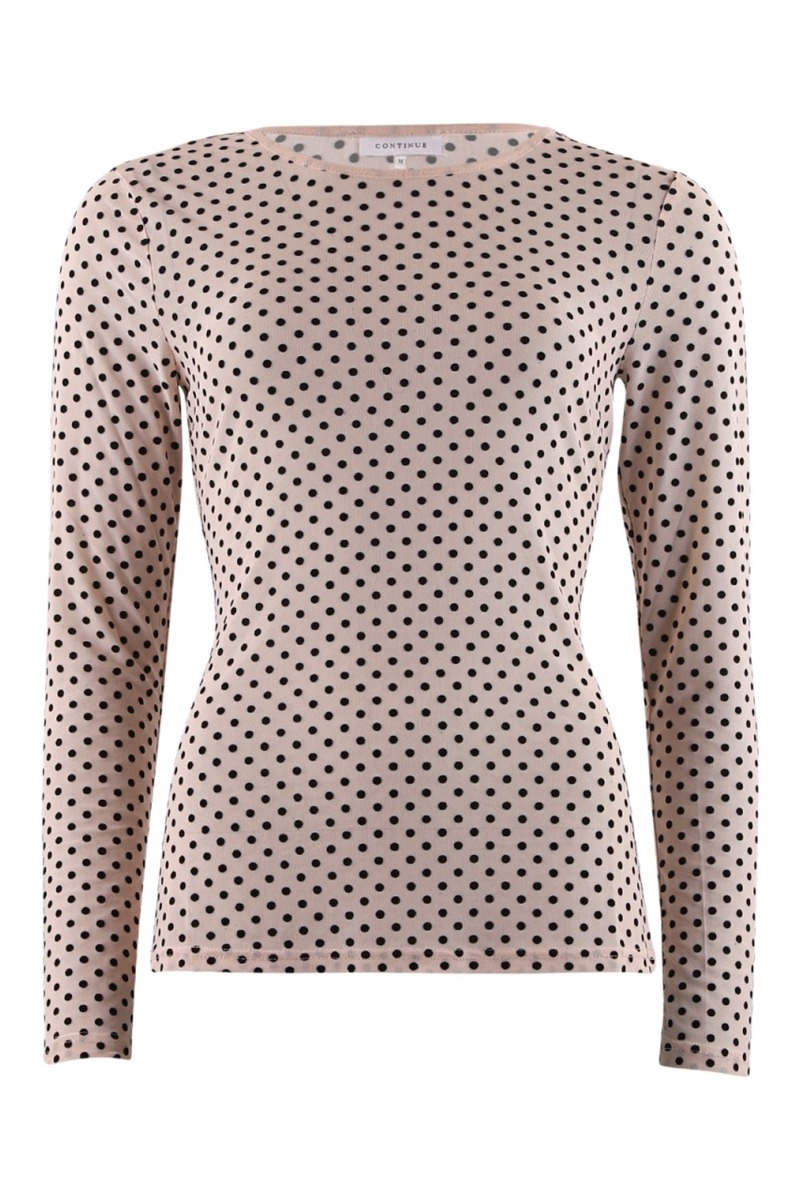 Beige mesh bluse fra Continue med små sorte prikker. Blusen har et tætsiddende design med lange ærmer og rund halsudskæring. En smuk bluse at style til både skjorter, kjoler og under blazere.