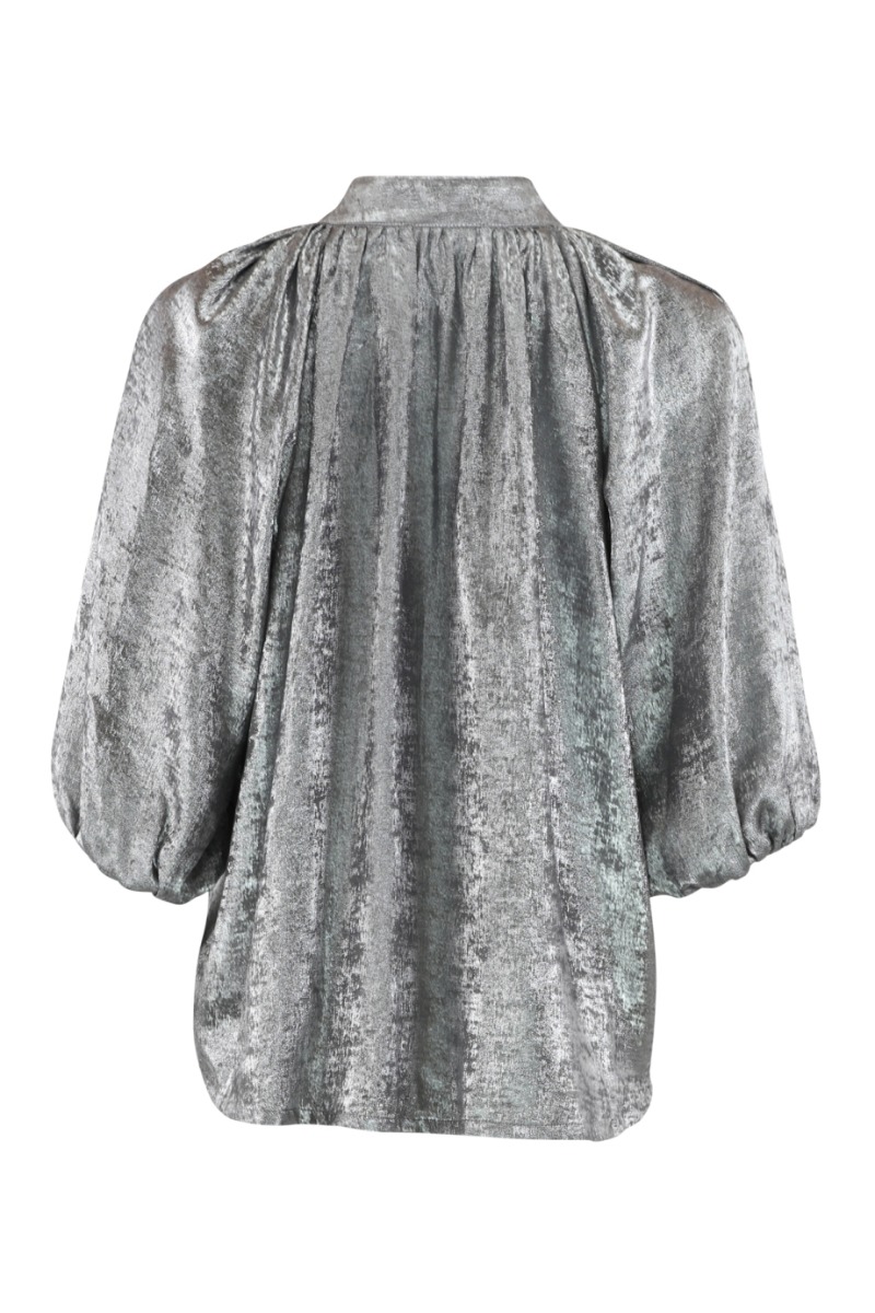 Fin bluse fra Continue. Blusen har en flot og festlig sølvfarvet nuance. Den har en løs pasform, elastik ved ærmerne som skaber en flot effekt og skjult knaplukning. En bluse som går til sort set ALT og egener sig til enhver lejlighed.