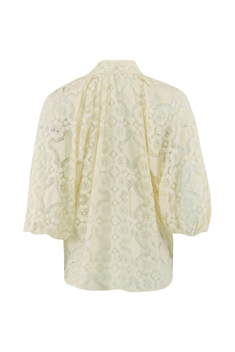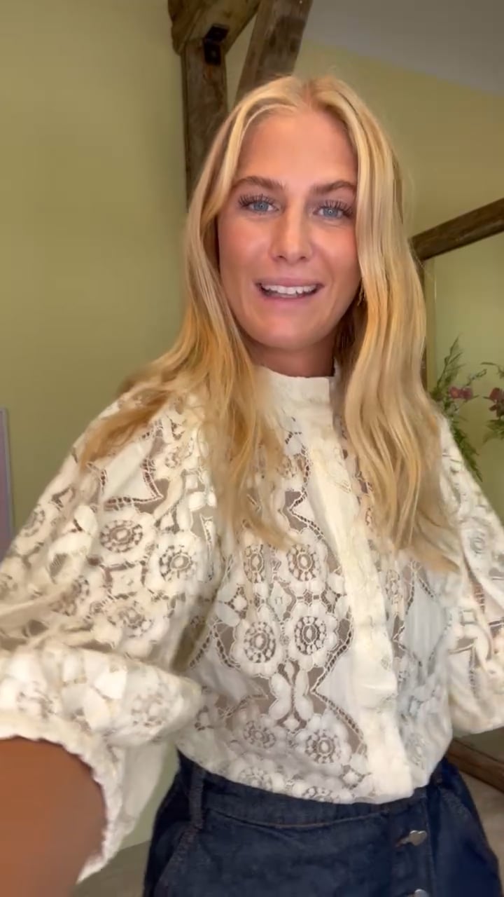 En super fin bluse fra Continue, som er fyldt med de flotteste blonder! Denne bluse har 3/4 pufærmer, skjulte knapper, og så er den en anelse gennemsigtig, så vi anbefaler at du bruger den med en top under.