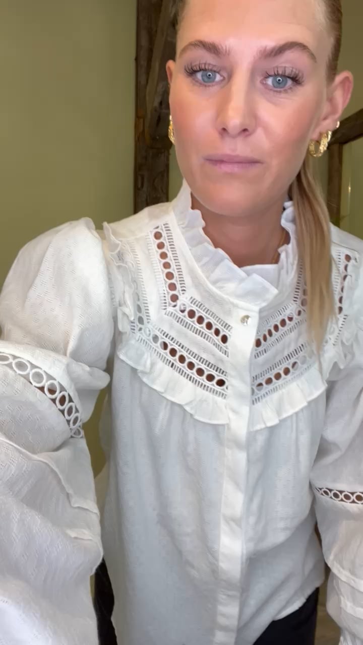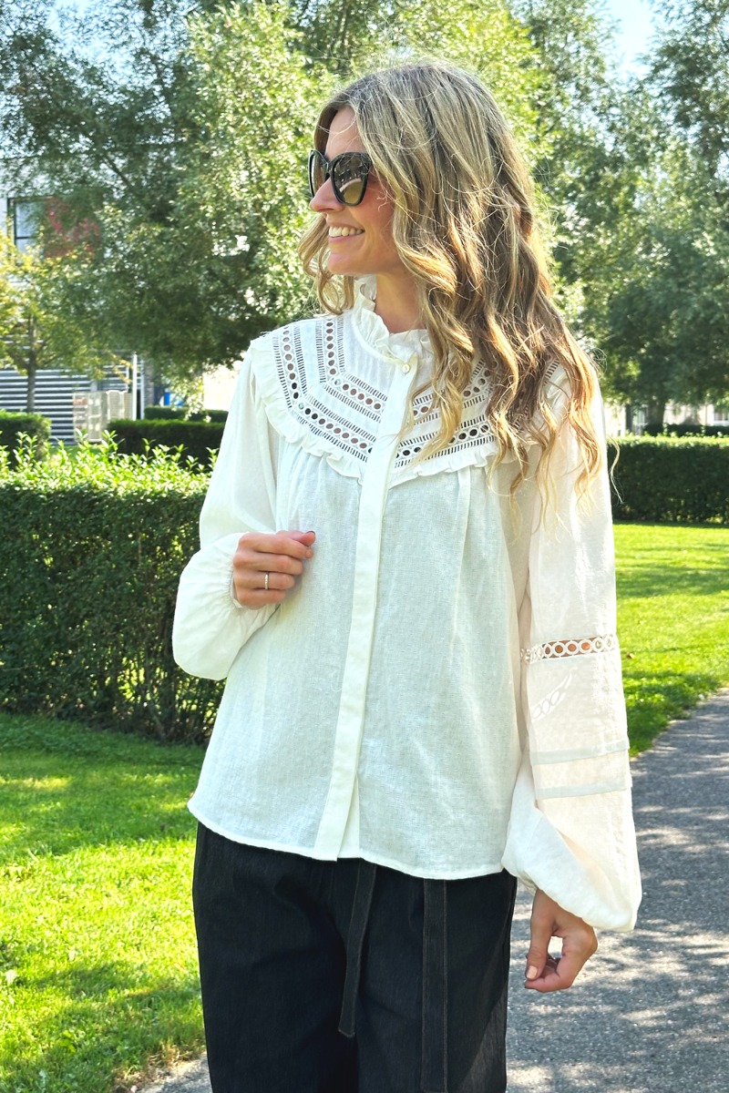 En super fin og elegant bluse fra Continue. Denne bluse har fine blonde- og flæsedetaljer, skjulte knapper og en flot krave. Den kan naturligvis bruges til både hverdag og fest!