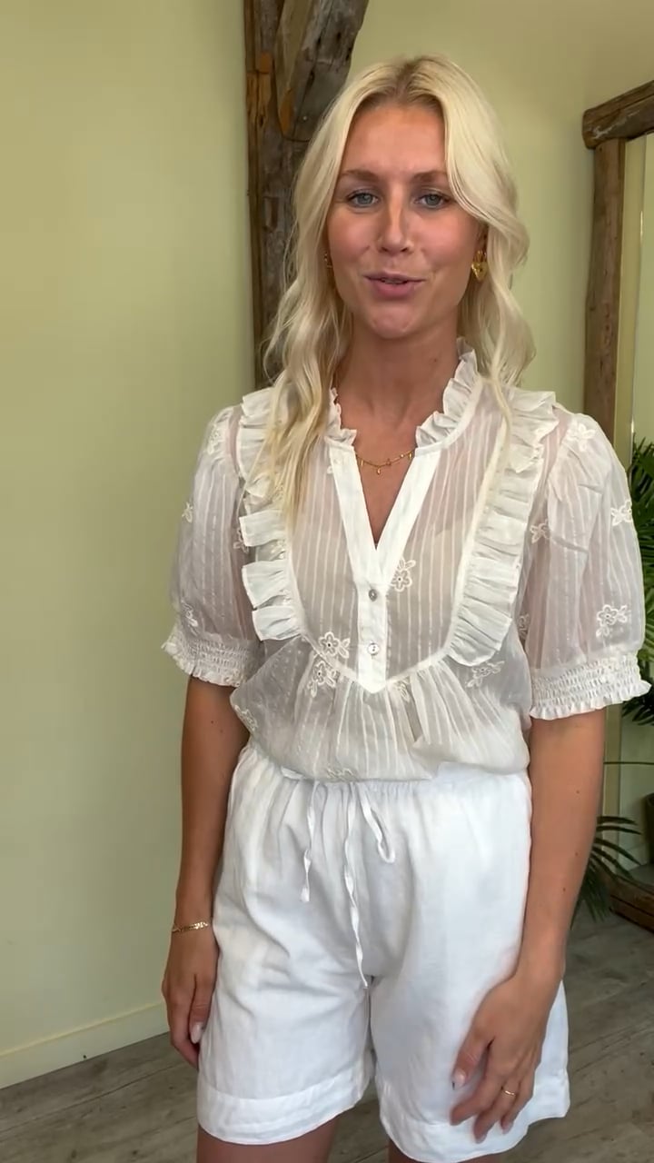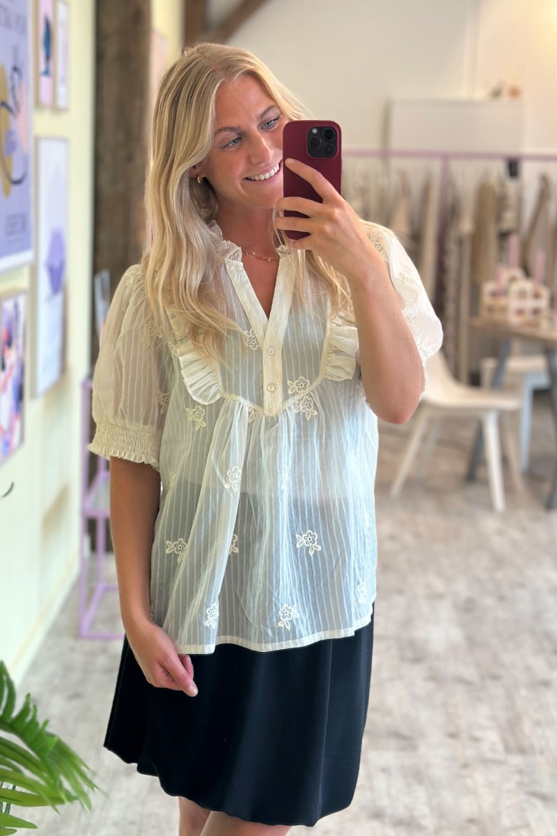 Sød bluse fra Continue med flæsedetaljer og små diskrete broderet blomster. Blusen er let gennemsigtig med stribet mønster og i en løs model. Style den med en top under og til alle dine underdele uanset anledning.