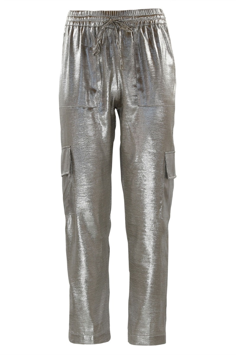 Seje guld sølv bukser fra Continue i metallisk look. Bukserne har et cargo lignende look i en let kvalitet med en bred elastikkant i livet og ved anklen der giver en god pasform. De kan justeres foran og har store lommedetaljer på benet. En PERFEKT buks til både fest og hverdag.