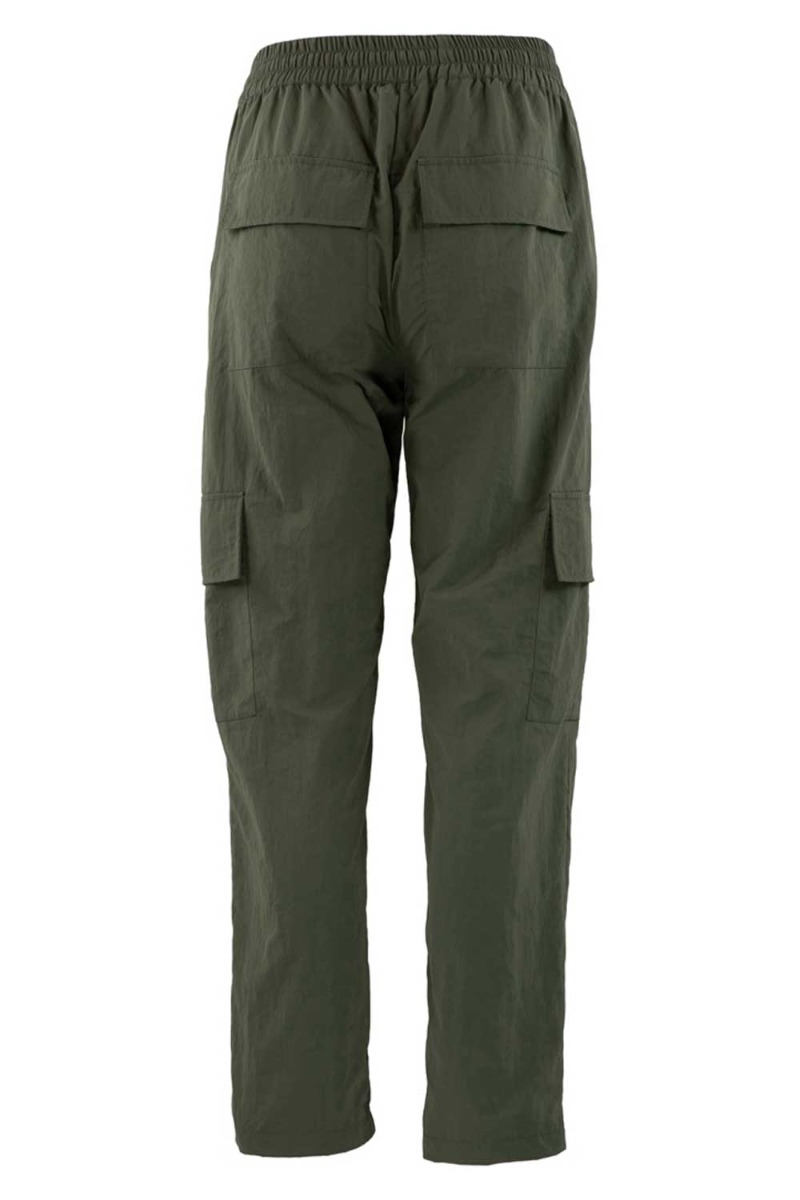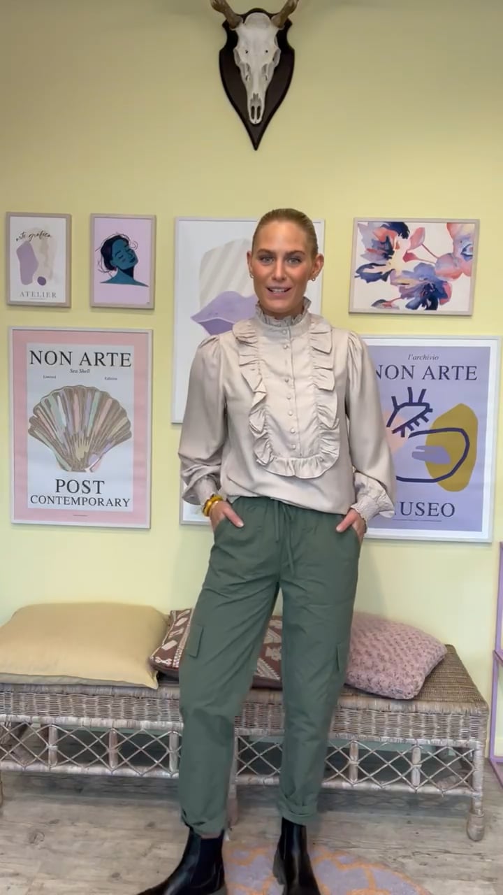 Grønne cargo bukser fra Continue med snøre i livet og store lommedetaljer. Bukserne er løse og går en smule ind i enden ved benene der giver en god klassisk pasform. De har en bred elastikkant i livet og er super cool at bruge til hverdag med en skjorte, blazer eller strik alt efter dit humør.