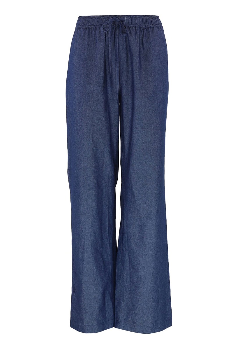 Et par fine bukser fra Continue i en blå denim kvalitet. Kvaliteten er helt tynd og let så den er behagelig at have på hele dagen. Derudover er der vide i benene og elastikkant i taljen samt et bindebånd. De kan bruges sammen med den matchende skjorte.