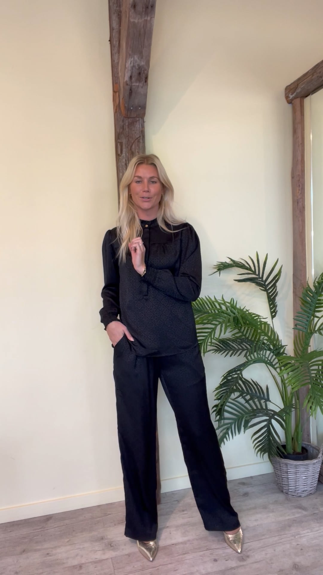 Et par skønne bukser fra Continue er kommet i en sort satin kvalitet. De er med vide i benene og har elastik i taljen samt lommer ved syningen i siden. I taljen markeres de med et lille bindebånd som kan laves til en fin sløjfe detalje. Derudover findes de også i beige og med matchende toppe.