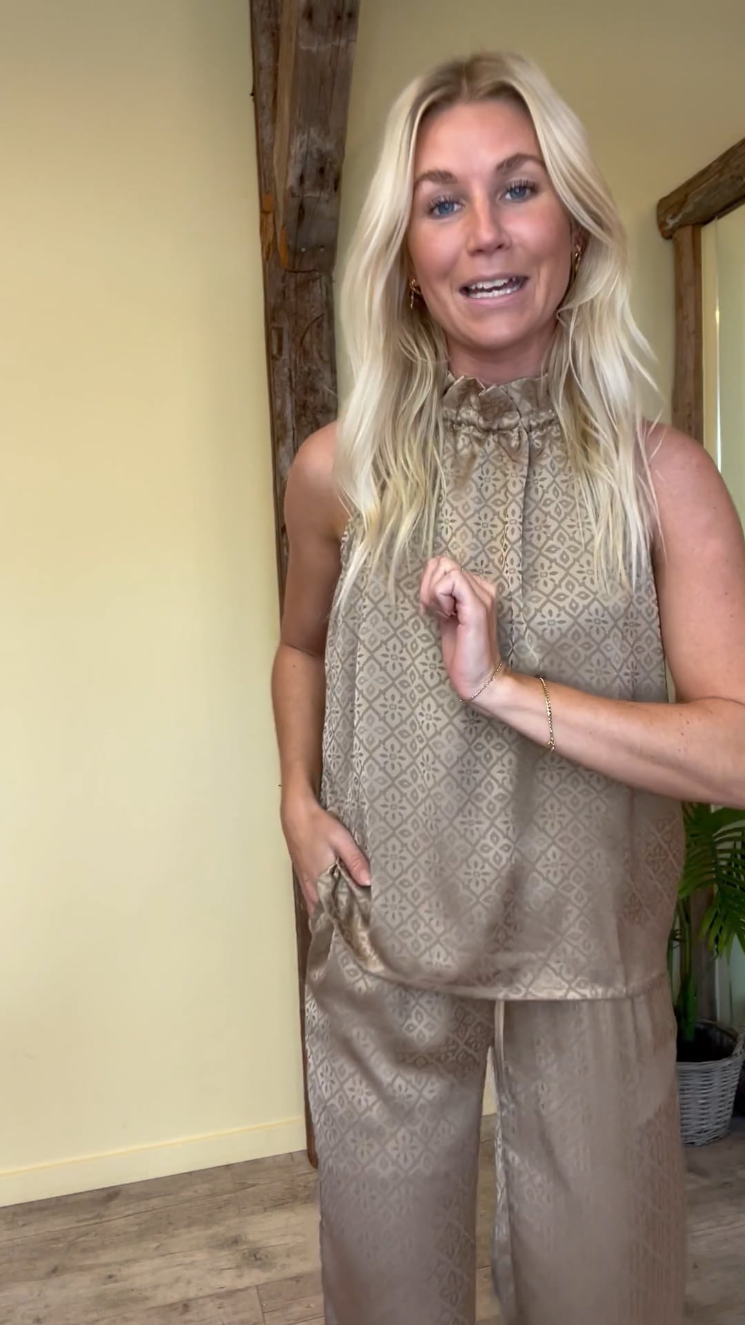 Et par smukke og feminine bukser fra Continue er kommet i en beige satin kvalitet. De er med vide i benene og har elastik i taljen samt lommer ved syningen i siden. I taljen markeres de med et lille bindebånd som kan laves til en fin sløjfe detalje. Derudover findes de også i sort og med matchende toppe.