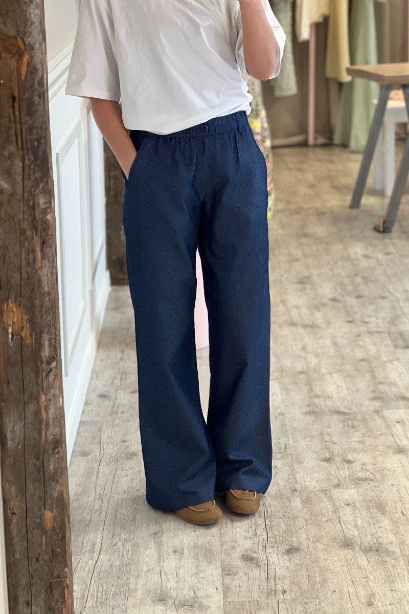 De fineste bukser fra Continue i en blå denim kvalitet. De er med vide i benene og har elastik i taljen. Derudover er der skrålommer i begge sider og de lukkes med lynlås og knap foran. Der er en smule stræk i kvaliteten men stadig så den er fast i kvaliteten.