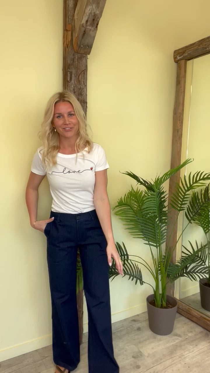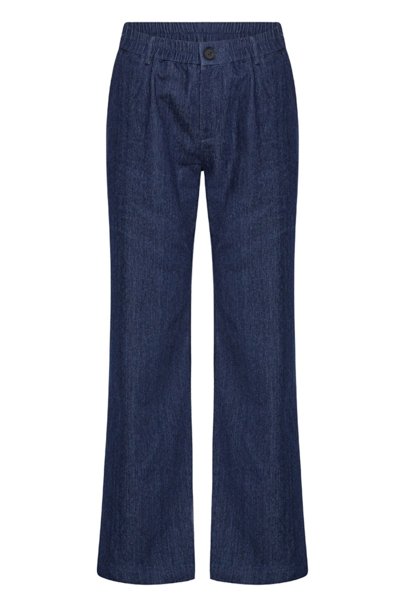 Et par skønne bukser fra Continue i mørk blå farve. Der er elastik i taljen og der er stræk i kvaliteten så den sidder tæt men uden at stramme. De er med vide i benene og de kan nemt styles til en simpel t-shirt.