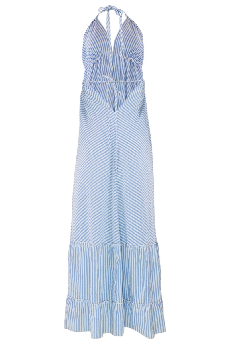 En rigtig sommerkjole fra Continue med striber i hvid og blå. Kjolen bindes bagpå under brystet og skal også bindes i nakken så man får dette halterneck look. Kjolen er helt let og perfekt til strandvejr. Derudover er den lang og med peplum i bunden som giver en anelse vide.