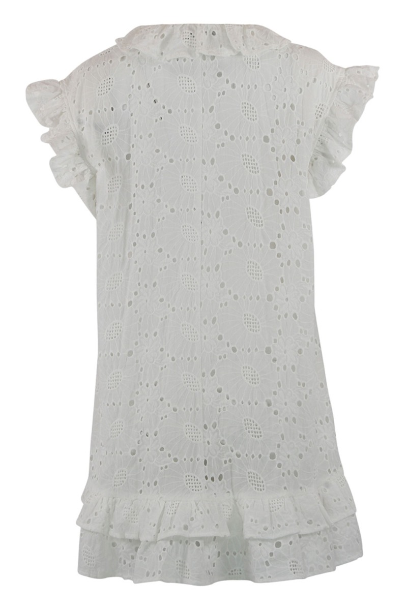 Hvid smuk sommerkjole fra Continue i en grov blonde. Kjolen er løst siddende med v-udskæring og snøredetalje ved kraven. Den er let gennemsigtig uden underkjole og vi anbefaler derfor at style med en top eller shorts under.