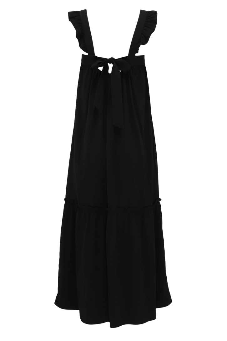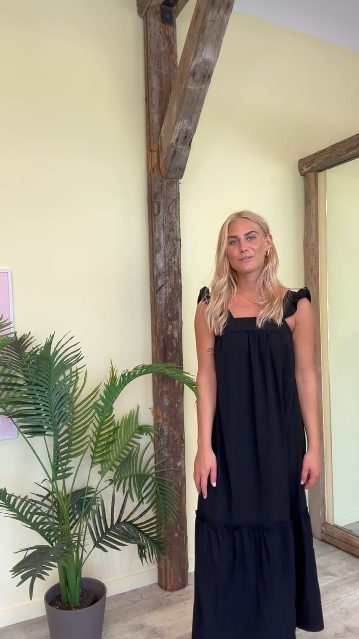 Sødeste fine kjole fra Continue i helt sort. Toppen er i et løst snit med de fineste flæsedetaljer på stropperne og firkantet udskæring. Bagtil er blusen åben med en flot sløjfedetalje der er oplagt både til en varm sommerdag og festerne.