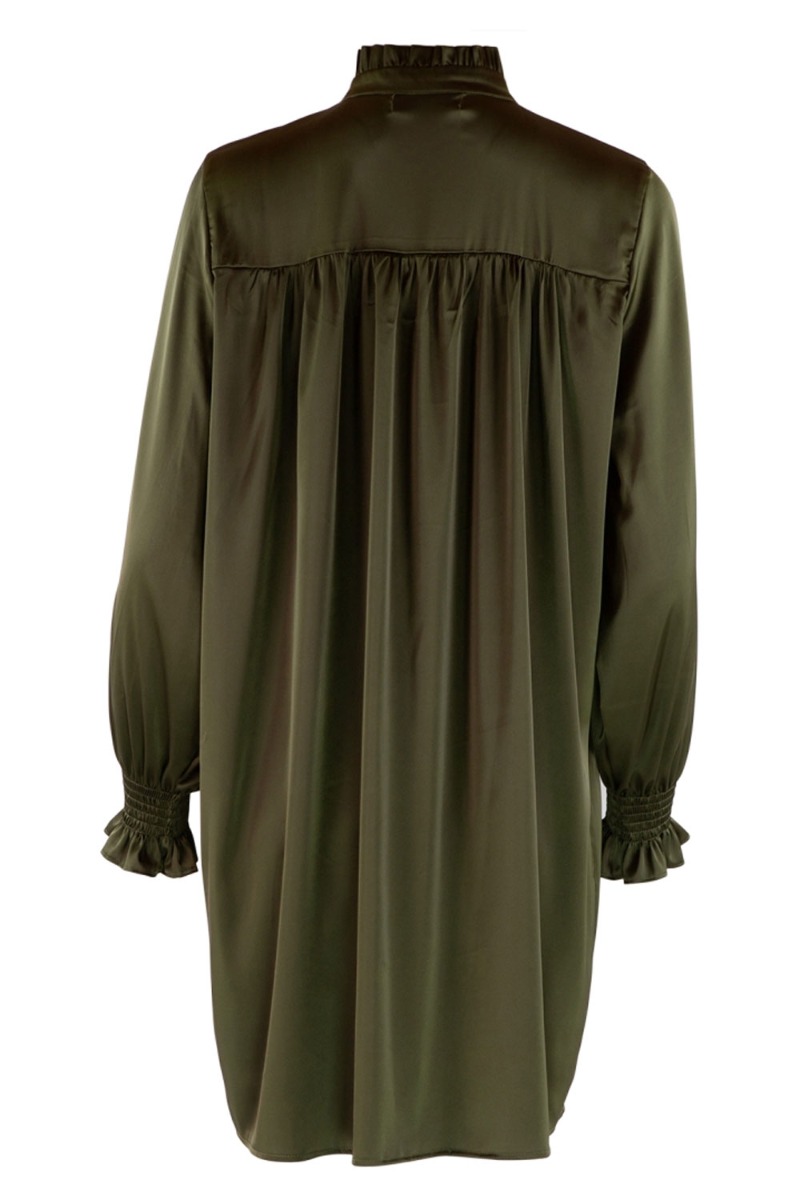 En rigtig fin enkel kjole fra Continue. Kjolen har en god længde med knapper foran og flæsedetaljer langs kanten. Kjolen har et silkeglat look der giver et ekstra elegant udtryk. Den er rummelig i modellen og findes i flere farver.