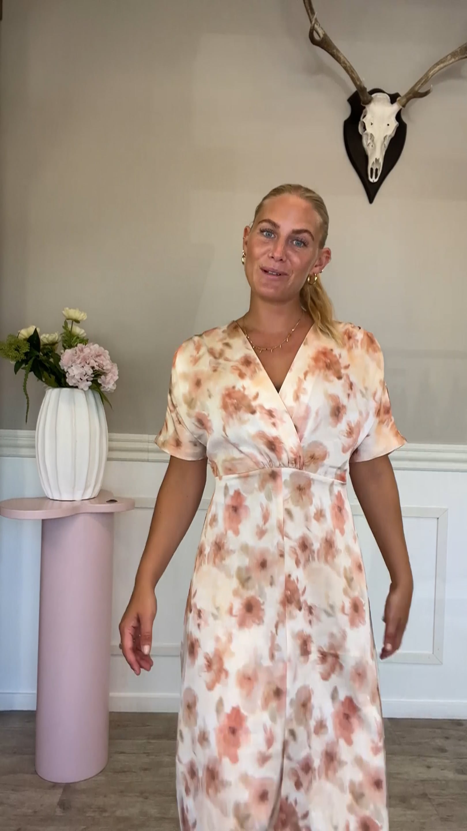 Her kommer den smukkeste kjole fra Continue i disse orange og gule nuancer. Den er med vi hals og har korte brede ærmer. Derudover er den med a snit i bunden og falder derfor også smukt på stortset alle kropstyper.