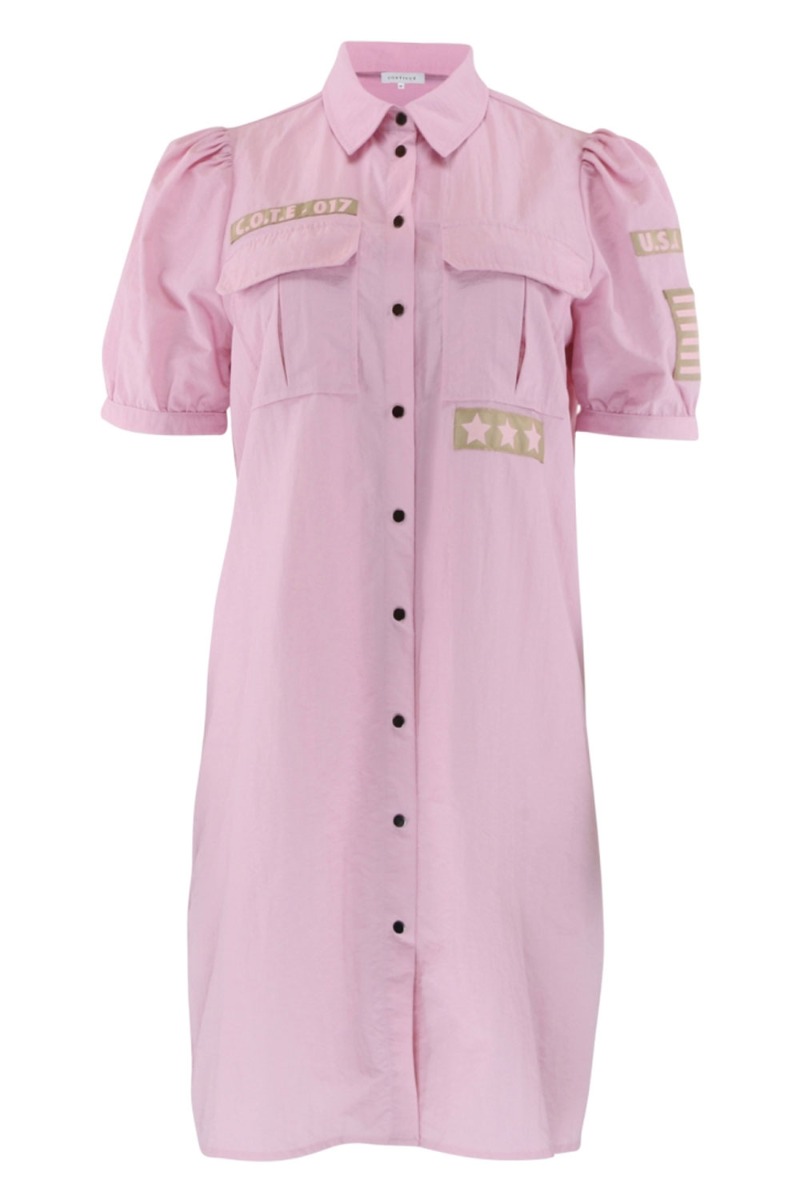 Cool kjole fra Continue i en lyserød nuance. Kjolen er med korte ærmer samt knapper hele vejen ned. Der er lommer på brystet og lidt "pilot" look over den, da den har de sejeste patches syget på. En super cool kjole at style til et par sneaks eller bare en let Havaianas.