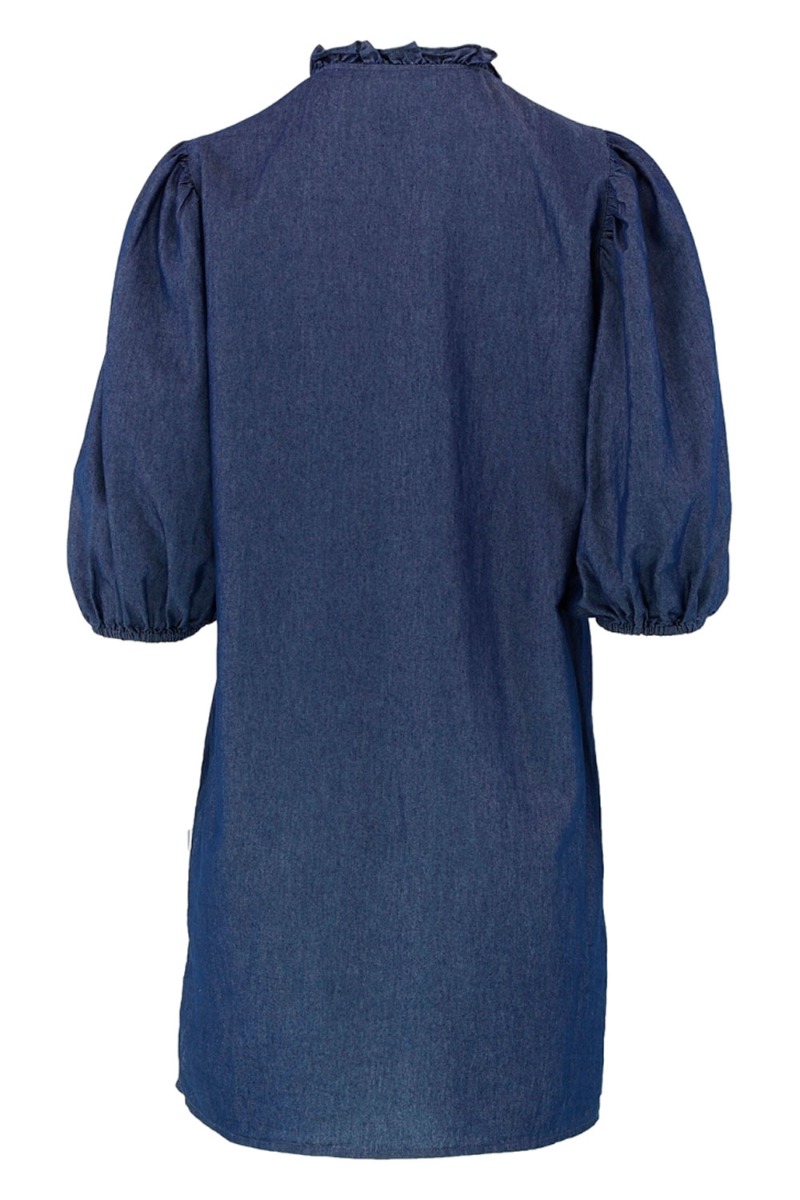 En fin denim kjole fra Continue er kommet i en smuk blå farve med perle detaljer ved brystet. Kjolen er en model vi kender nemlig Milli modellen. Der lukkes foran med trykknapper og har 2/4 lange puf ærmer. Den er let i kvaliteten og behagelig at ahve hele dagen.