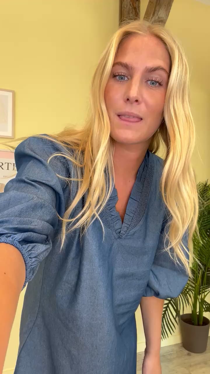En fin kjole fra Continue i en let denim kvalitet i en smuk blå farve. Den er med A snit og passer derfor alle kropstyper. Den er med korte ballonærmer og ved V hals der markeres med smock. Den er fin til hverdag med en sandal eller til fest med en stilet.