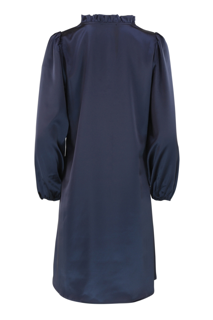 En stilren kjole fra Continue. Denne kjole har en skinnende effekt, i sit lækre materiale! Kjolen har ballonærmer, som giver en fin detalje til en ellers meget simpel kjole. Kraven har flæser og et feminint udtryk.