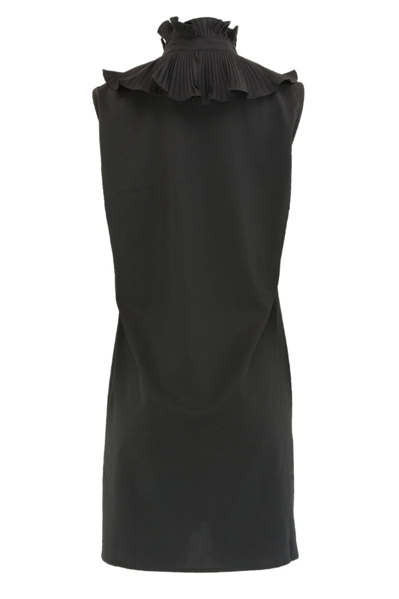 Man går aldrig galt i byen med en flot enkel sort kjole som denne fra Continue. Kjolen har et klassisk snit der falder let løst med gennemgående knapper foran. Den er uden ærmer og har de smukkeste plisseret flæsedetaljer foran langs kraven. Denne kjole er helt sikkert oplagt til diverse fester og arrangementer med stiletter, sandaler eller støvler.