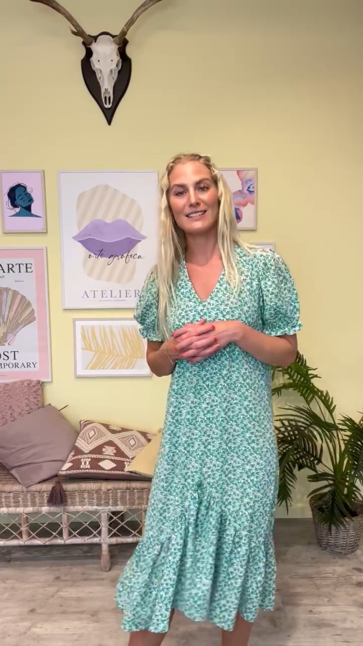 Grøn blomsterkjole fra Continue i en feminin pasform med v-udskæring og korte pufærmer der afsluttes med elastik og en sød flæsekant. Kjolen er lavet i en let kvalitet med peplum i bunden. Bundfarven er hvid med grønne og rosa nuancer der giver et dejligt strejf at sol og sommer.