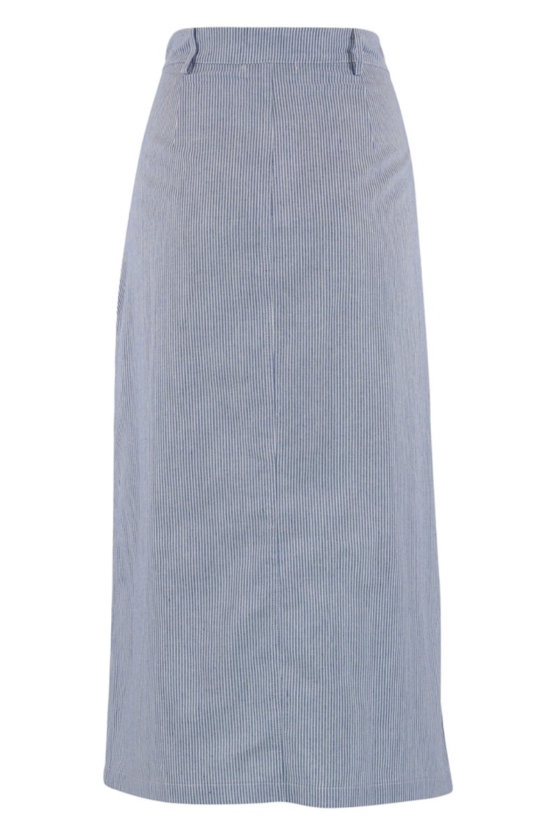 Cool nederdel fra Continue i hvid og blå stribet mønster. Nederdelen er mellemlang med fast linning der lukkes foran. Den er lavet i en dejlig let kvalitet med en lille slids detalje foran. Style den med en t-shirt eller skjorte alt efter hvad anledning du skal til.