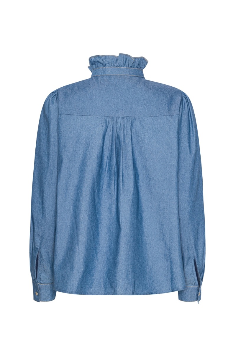 En super fin skjorte fra Continue i et tyndt denimlook. Skjorten har flotte guldknapper halvvejs ned, som markeres ved en fin flæsekant. Der er en lille rynkedetalje ved skulderen og ærmerne lukkes med en guldknap ved håndleddet, som dermed giver ærmerne et fint ballonsnit.
