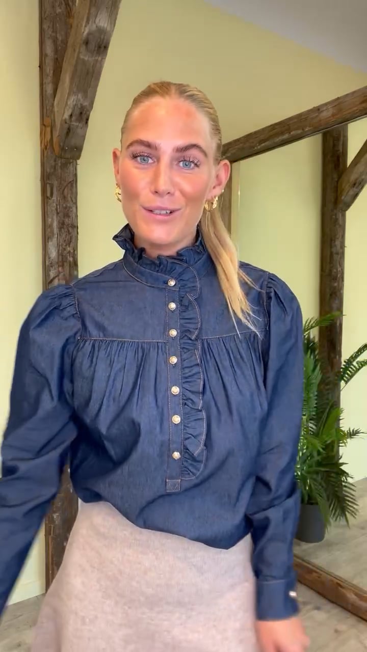En smuk og feminin skjorte fra Continue i en mørk blå denim farve. Skjorten har guldknapper halvvejs ned samt en fin flæsekant, som går igen ved kraven. Der er en lille rynkedetalje ved skulderen og ærmerne lukkes med en guldknap ved håndleddet, som dermed giver ærmerne et fint ballonsnit.